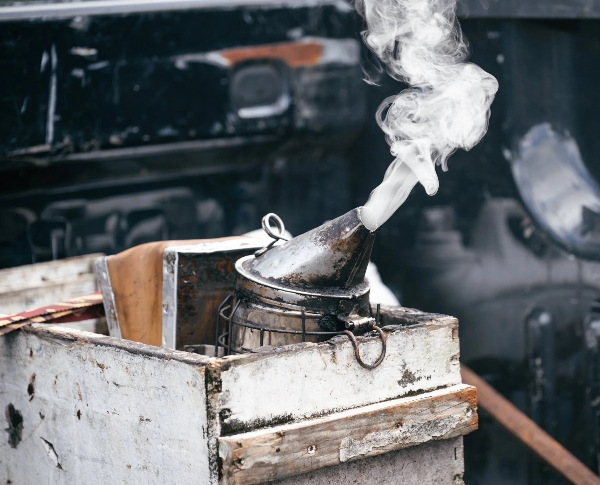 Ben manages his 60 hives at three week intervals. He keeps queens bred for varroa mite resistance to reduce the need for harsh interventions.